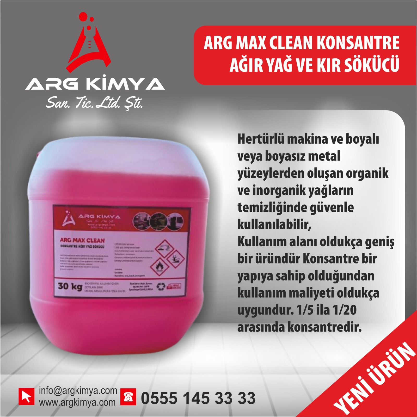 Çok amaçlı temizlik kimyasalı Arg max clean, otomobil fabrikalarının boyama sonrasında fırınlarında kalan yağ ve kirliliğin temizliğinde güvenle kullanılır. Metallerin tamamının silinerek kolayca yağdan arındırılmasını sağlar. Makine yüzeylerinin temizlenmesinde oldukça etkilidir.